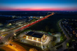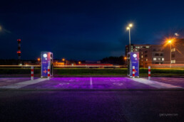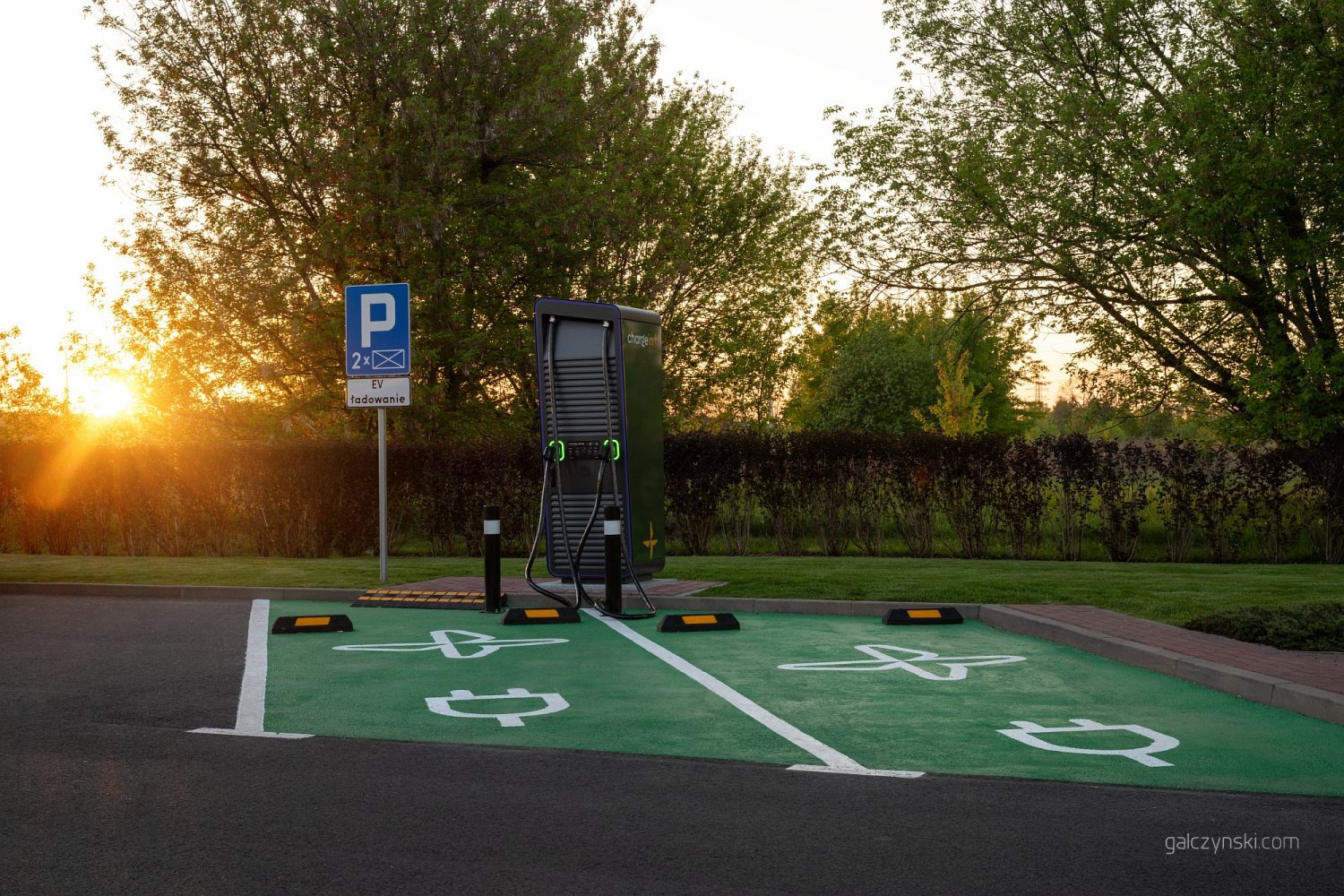 Innym miejscem, które również miło wspominam był McDonalds w Żninie. Z jednej strony restauracja, park handlowy – Pepco, Media Expert i tak dalej. A z drugiej puste pola, gdzieś daleko w tle wiatraki i zachód słońca. To tło się wpisało w tematykę zdjęć ładowarek elektrycznych, w końcu energia wiatru i słońca idealnie pasowałaby do zasilania pojazdów. Ale też nowoczesne obudowy tych urządzeń wyglądają bardzo obco i futurystycznie w środku pustego pola :) Na szczęście w pozostałych kierunkach było pełno zaparkowanych samochodów…